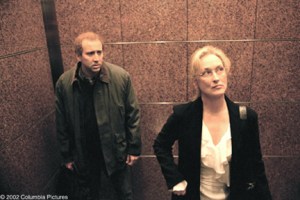 In these ways, I totally and full heartedly sympathize with the protagonist in this movie— a miserable, fat, balding character named Charlie Kaufman (played by Nicholas Cage), who co-wrote Adaptation. with his fictional identical twin brother, Donald (also played by Nicholas Cage).  The result of this unlikely collaboration is an Academy Award nominated screenplay revolving around a morose screenwriter who is struggling mightily to adapt a book about flowers into a screenplay.  So, really, just as you have two writers, you have two movies here.  In one movie, you get a simple, straightforward adaptation of the book, “The Orchid Thief,” which, by the way, is a real book in the real world written by a real person (Susan Orlean, played by Meryl Streep).  In the other movie, you get a self-reflexive story about a lonely screenwriter failing in both love and in adapting Susan Orlean’s book (mentioned above).  These two complimentary stories interweave with one another in a symbiotic way until they literally crash into each other in the end.